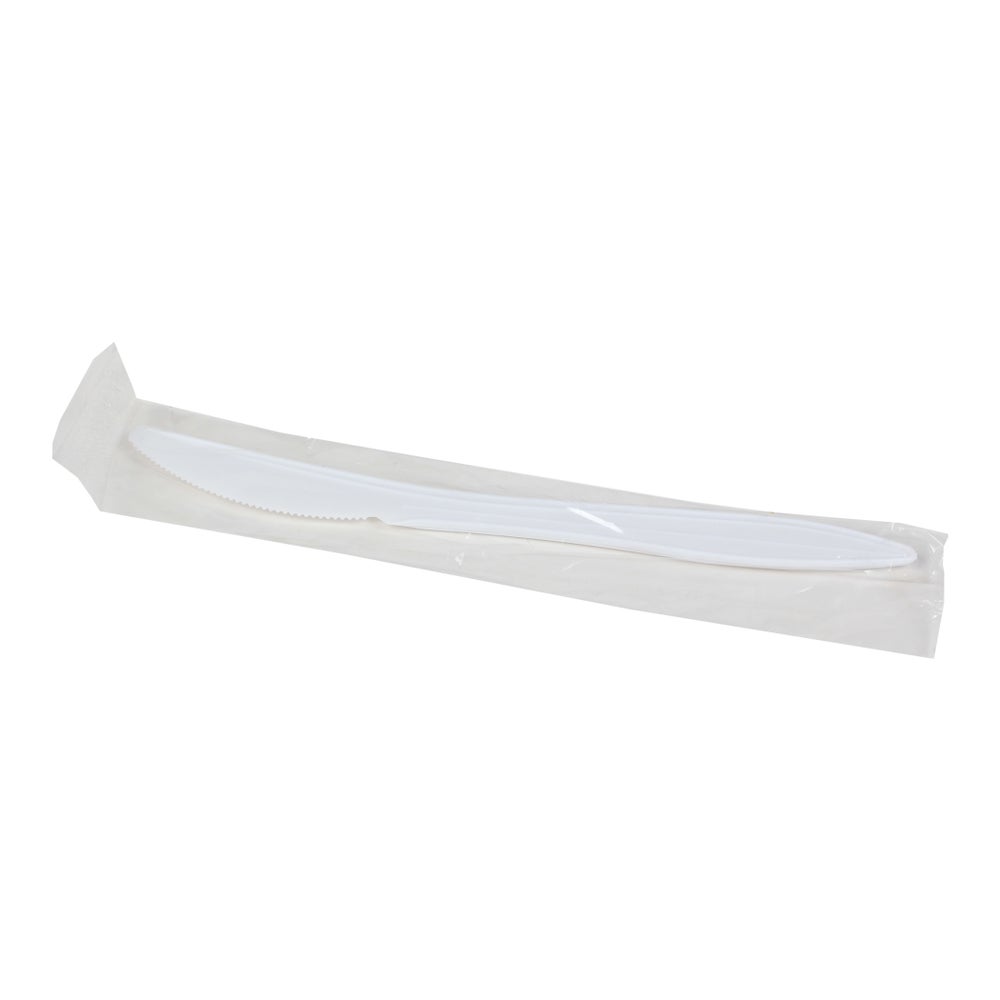 These disposable, individual white plastic knives are wrapped in a polypropylene bag for safety and convenience in foodservice, healthcare, hotel, and to-go programs.