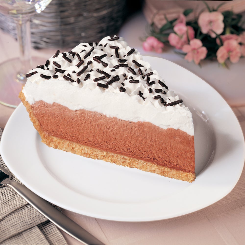 These pies feature sweet, well-balanced, milk chocolate filling, whipped topping rosettes, finished with a shower of chocolate sprinkles.