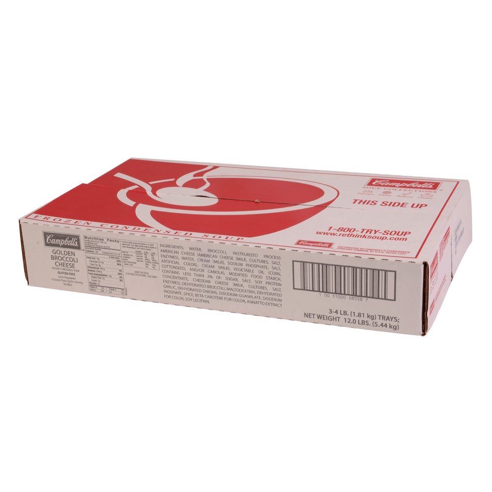 A bowl of our Golden Broccoli Cheese Soup, served with fresh-baked bread, is hearty enough to serve on its own, or you can premium-ize it with whatever's fresh in your kitchen. This frozen soup has a storage life of 638 days in your freezer and yields approximately 384 fluid ounces of hearty soup. At Campbell's Foodservice, we make carefully crafted soups, so you can be proud to use and serve them all year long. Made with carefully selected ingredients with options rich in protein, fiber, or vitamins, our soups are full of what guests love, not what they don't.