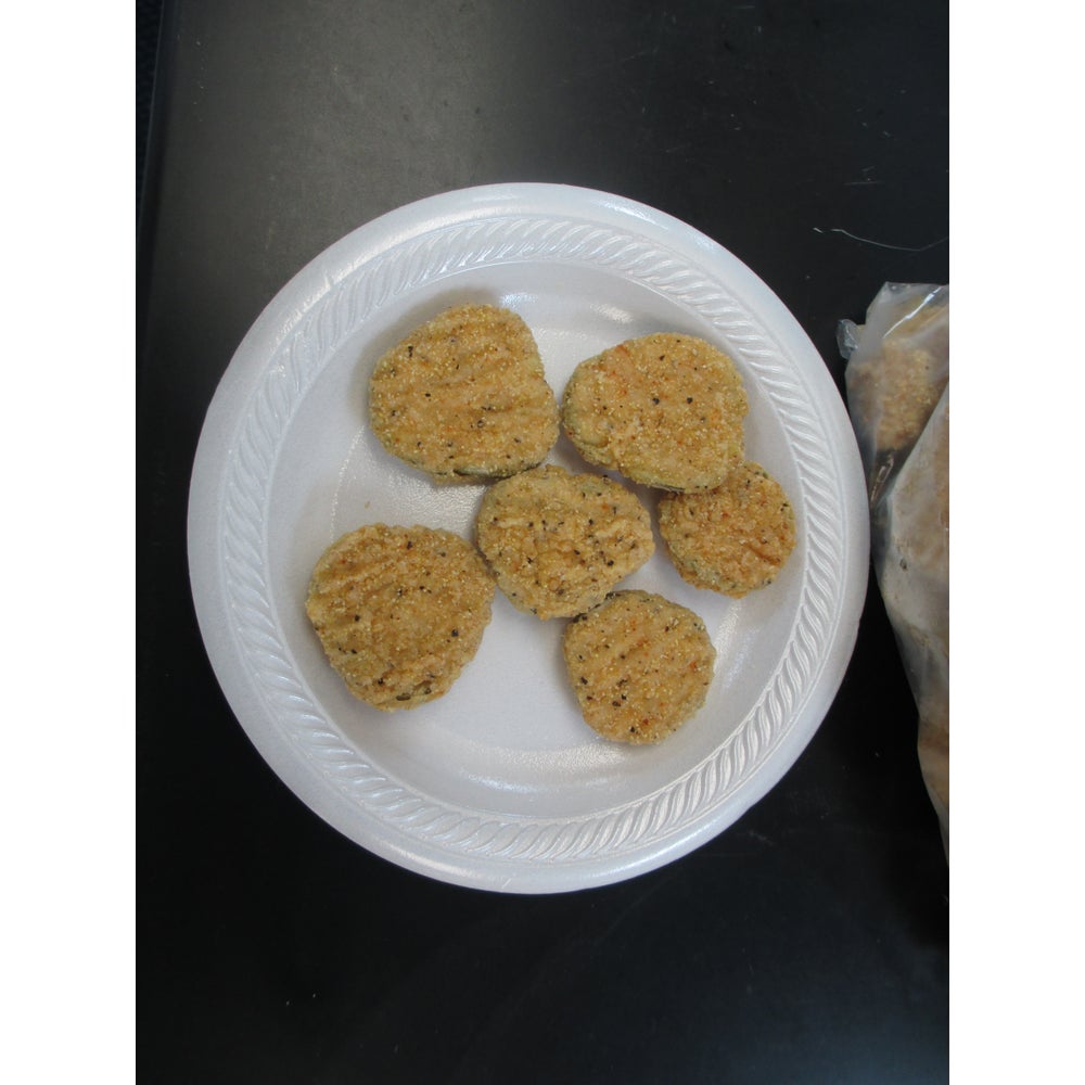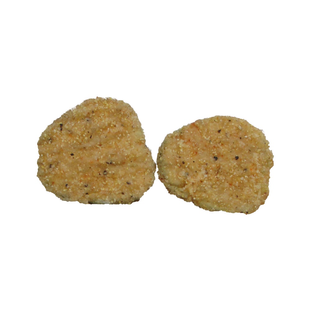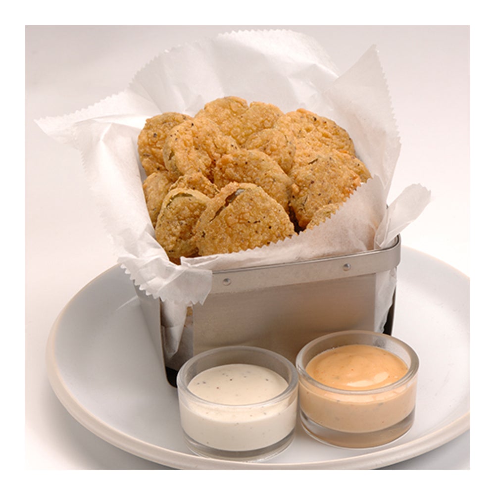 These breaded pickle chips are made with crinkle-cut dill slices and seasoned flour. They are parfried and individually quick-frozen, making them ideal for frying and using for appetizers and entrees.