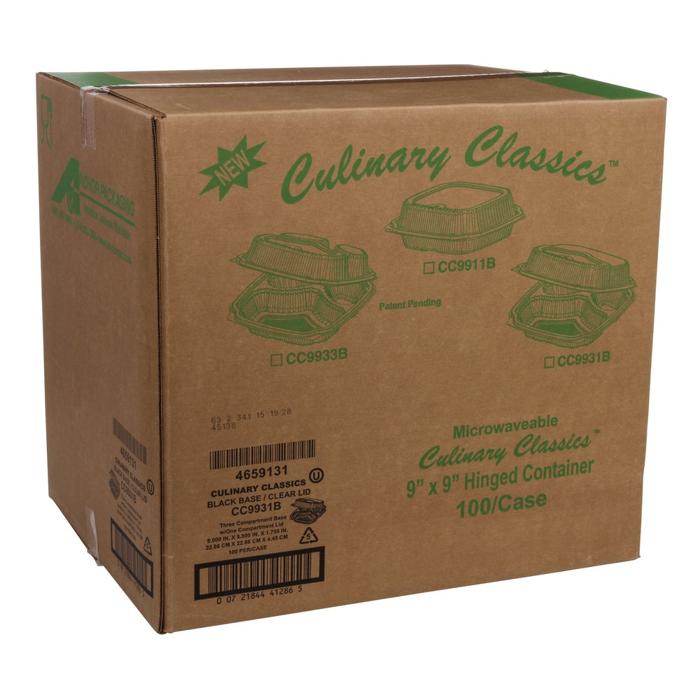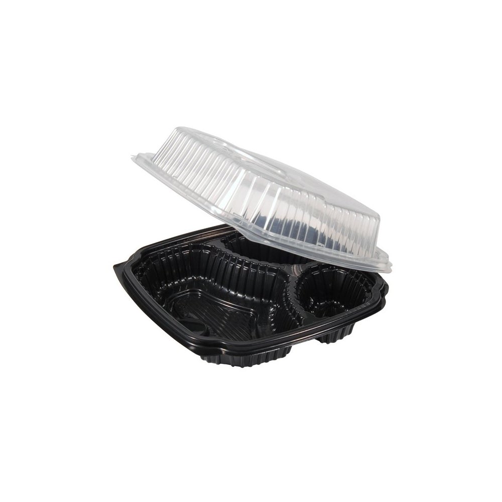 Containers, 3-Compartment, 9 x 9 Inch, Microwaveable Plastic, Black, Hinged, Vented, Polypropylene, 50 Ct Package, 2 Per Case