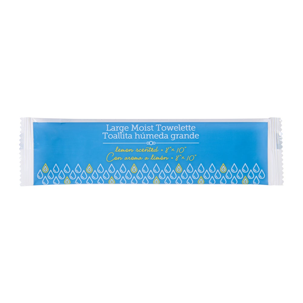 - These large moist towelettes are individually wrapped so they stay moist and sanitary. Citrus- and berry-scented, they are perfect for cleaning hands before and after meals. These towelettes feature an attractive, tear-open packaging design, enhancing the image of a variety of take-out applications.