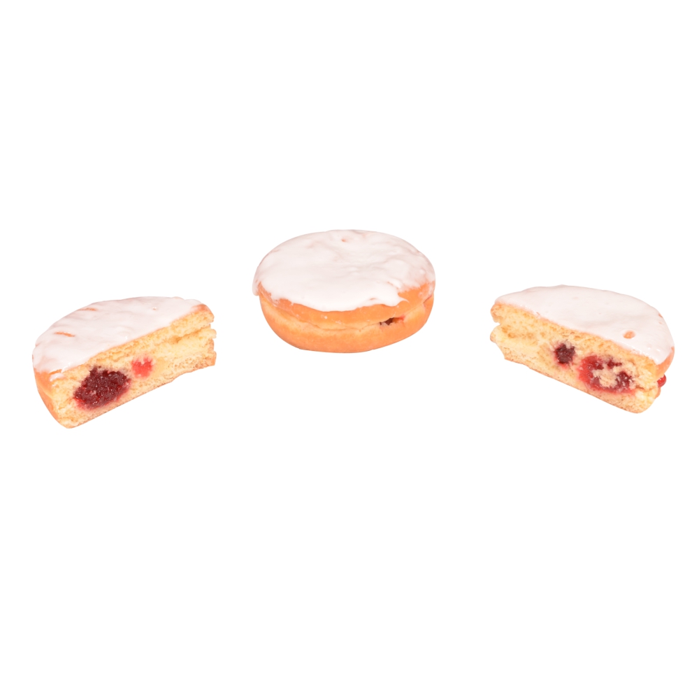 Donuts, Bismark, Yeast-Raised, Raspberry-Filled White Iced, Fully Baked, Frozen, 3.5 Ounce, 6 Ct Tray, 8 Per Case