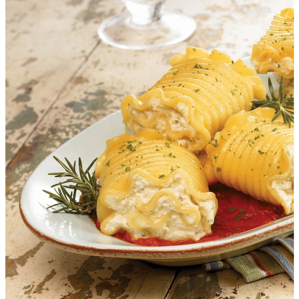 These pasta roll-ups are made with a cheese filling that is rolled up in ribbed, enriched wheat pasta.