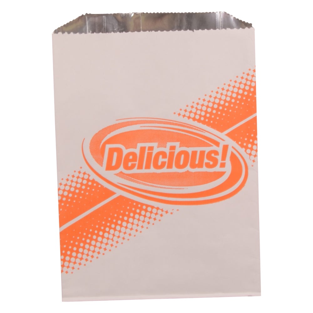 These "Delicious!" printed, foil bags retain heat and absorb steam so food stays fresh and doesn't get soggy.