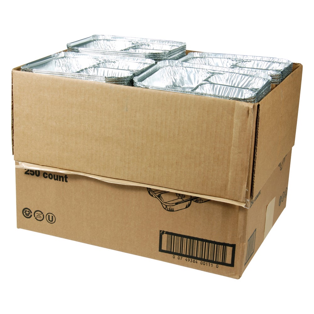 These 35 gauge rectangular foil containers with a full curl rim have two quarter-sized compartments, one half-sized compartment, and a heavy gauge cardboard lid. They go from freezer to oven and are ideal for meal delivery organizations.