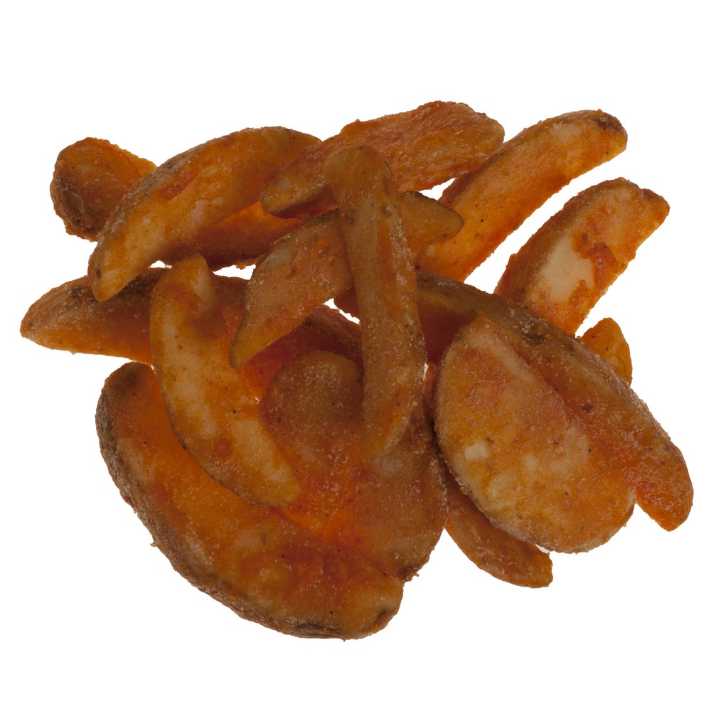 These potato wedges are cut long with the skin on and feature a light, red-batter coating that adds color and flavor.