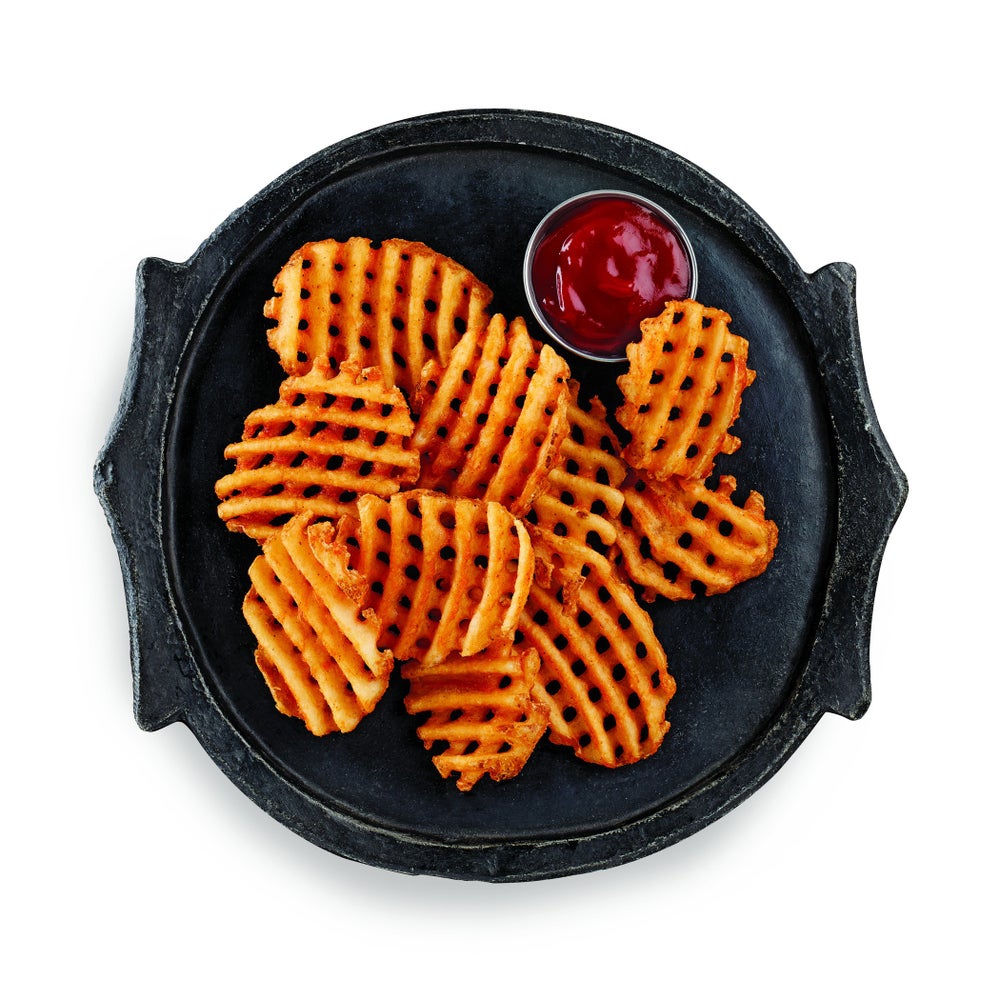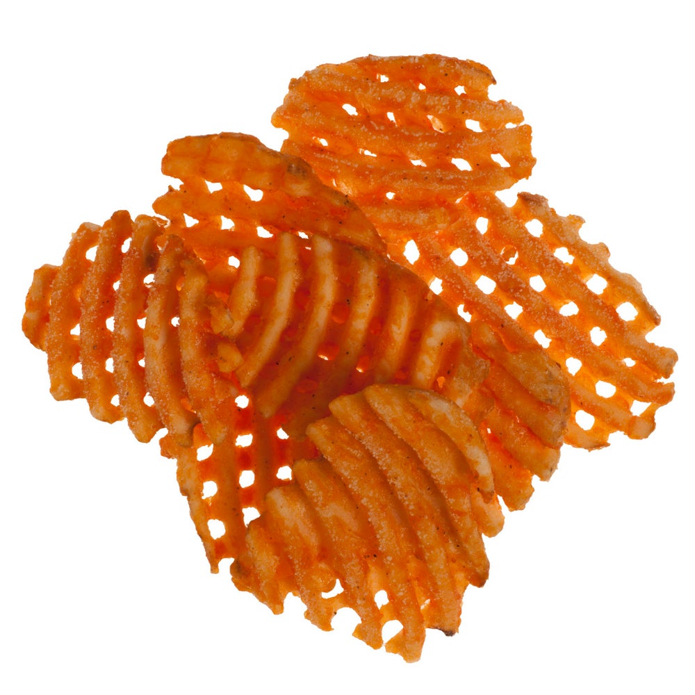 These whole, waffle-cut fries feature a light, red-batter coating with a distinctive flavor.