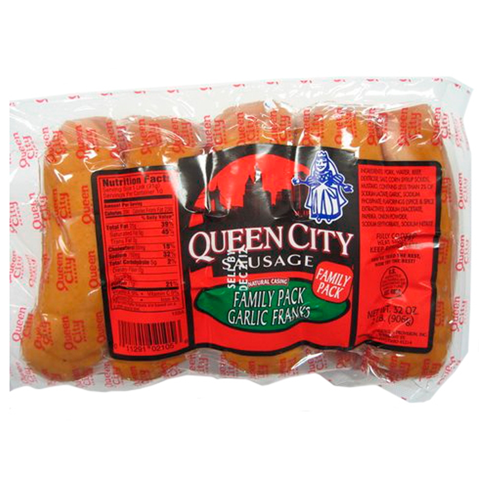 Queen City Sausage Garlic Knockwurst Pork & Beef Whole Hog, Jumbo, Links, Natural Casing, 5 Count per Pound, Fully-Cooked, Fresh, 2 Lb Bag, 8/Case
