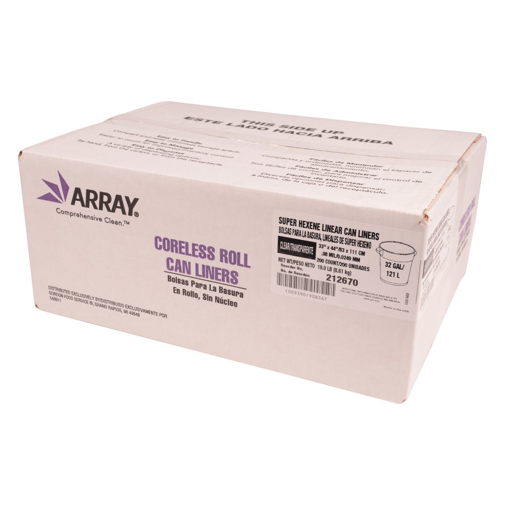 Array 32 Gallon Clear Can Liners, Super Hexene, 0.98 Mil, 33 x 44 Inches, 20 Ct Roll, 10/Case