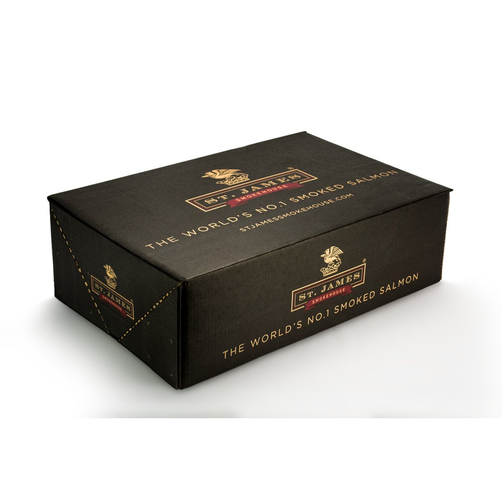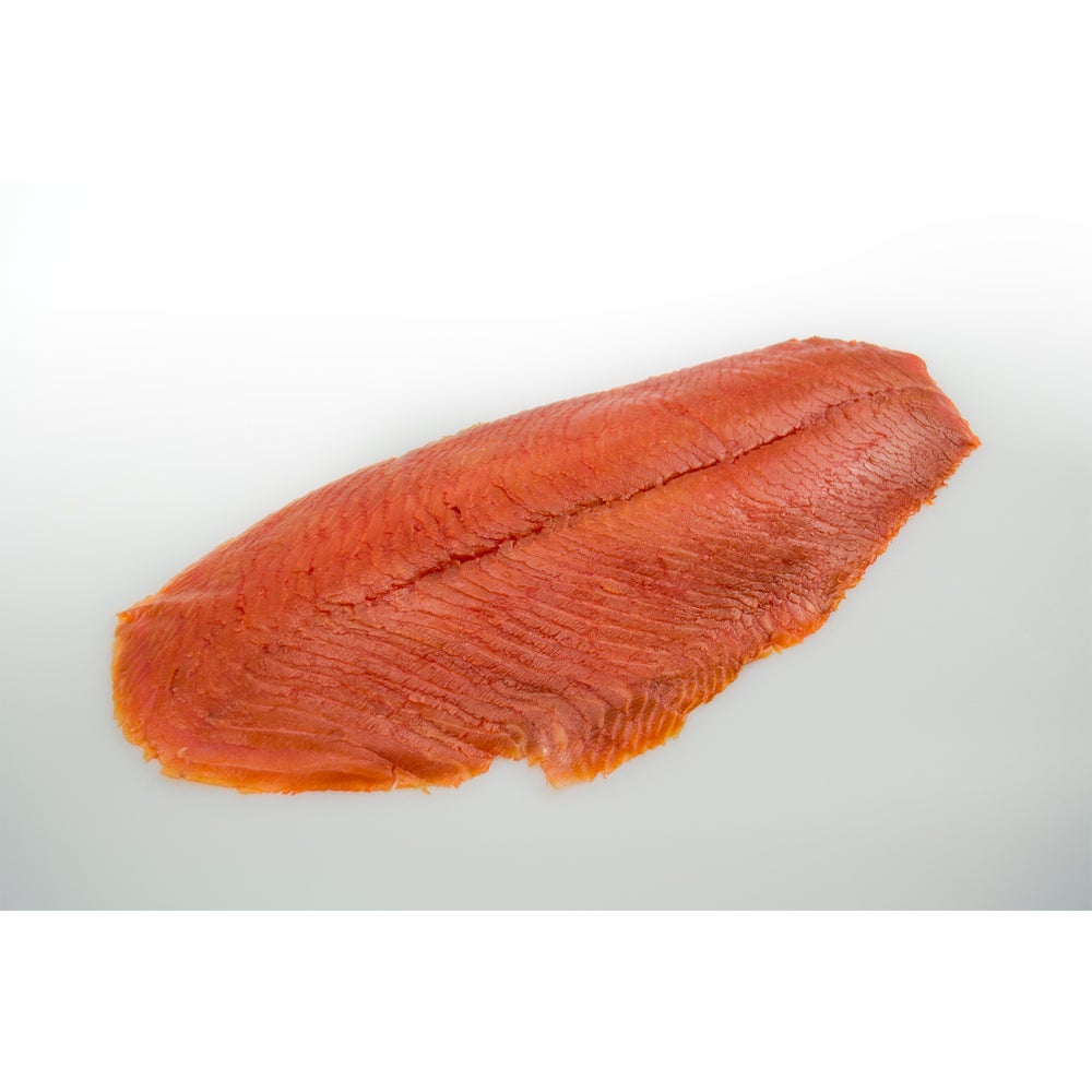 This sliced, skinless salmon is cured using a salt sugar blend, and cured for seven hours. The filets are then gently smoked over whisky oak chippings for three days, to create a unique smoke flavor.