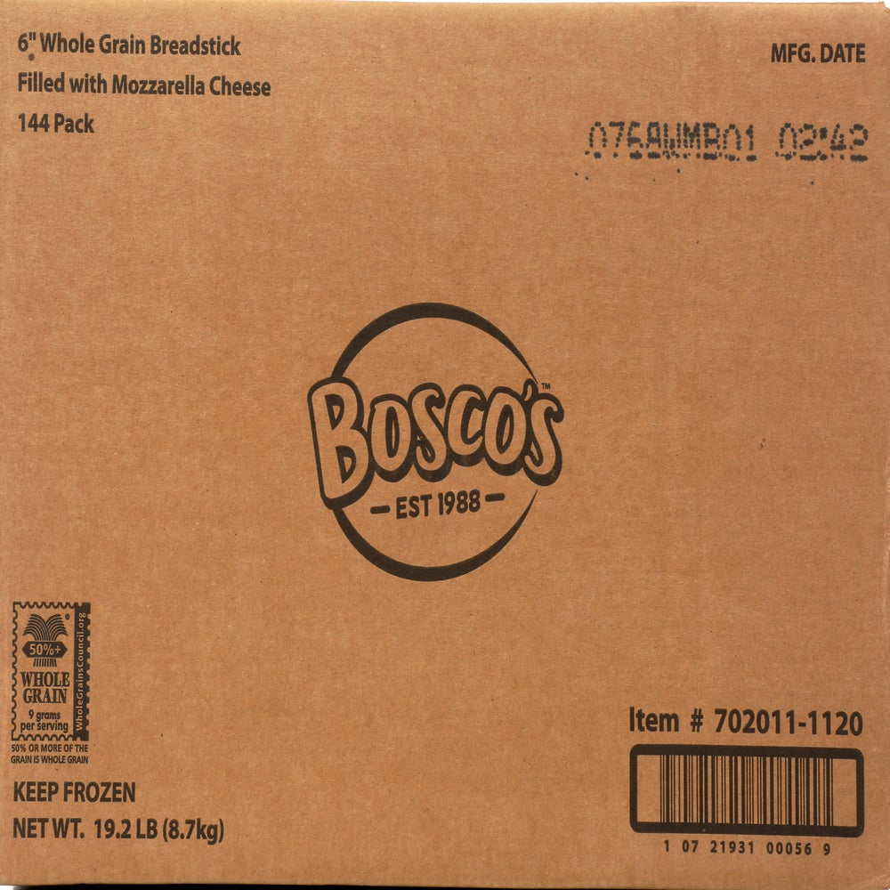 Bosco's Stuffed Whole Grain Cheese Breadsticks, Reduced-Fat, 6 Inch, Frozen, 2 Ounce, 144 Ct Bag, 1/Case