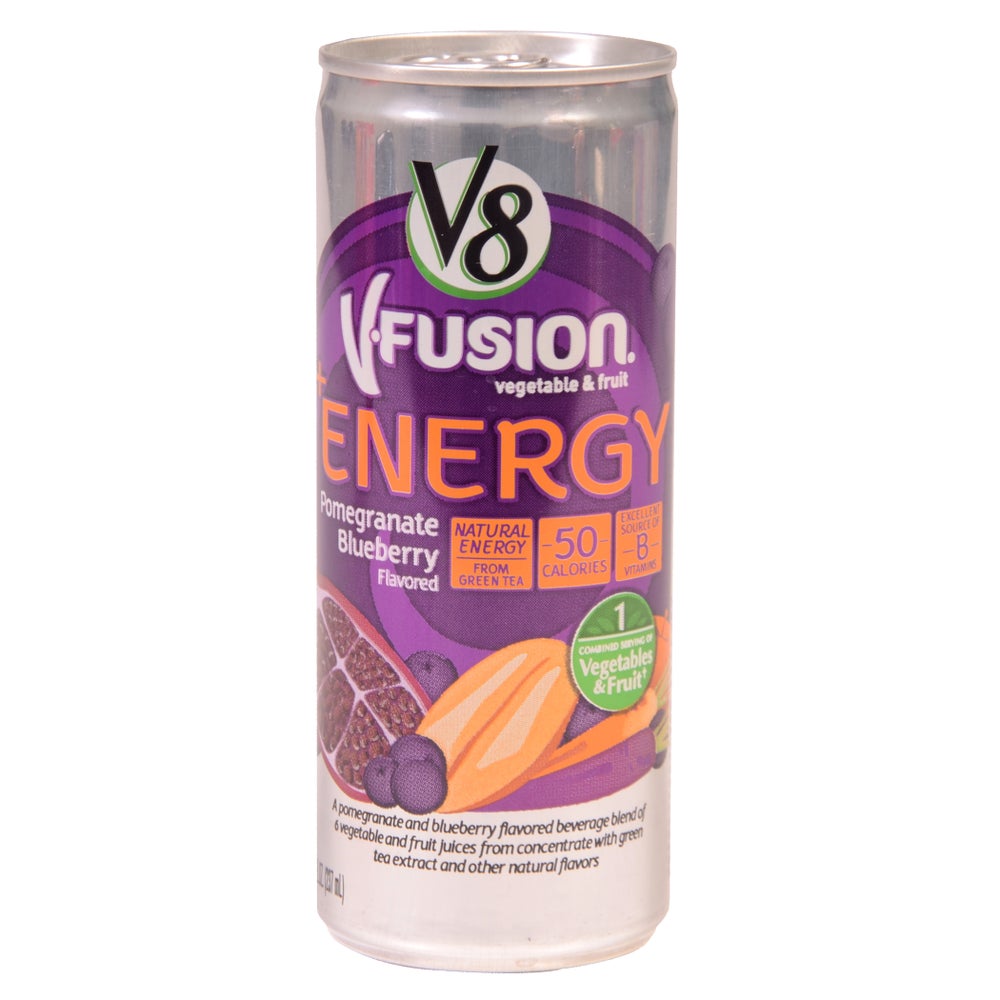 V8 50% Fruit Vegetable Blend No Sugar Added Energy Infused Pomegranate Blueberry Drink, Shelf-Stable, Single-Serve, Can, 6 Ct Package, 4/Case