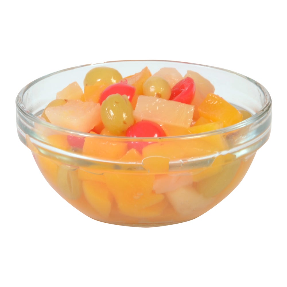 These fruit cocktails are a blend of sliced and diced ripe peaches, pears, grapes, pineapple, and cherries, packed in an extra light syrup with no added preservatives.