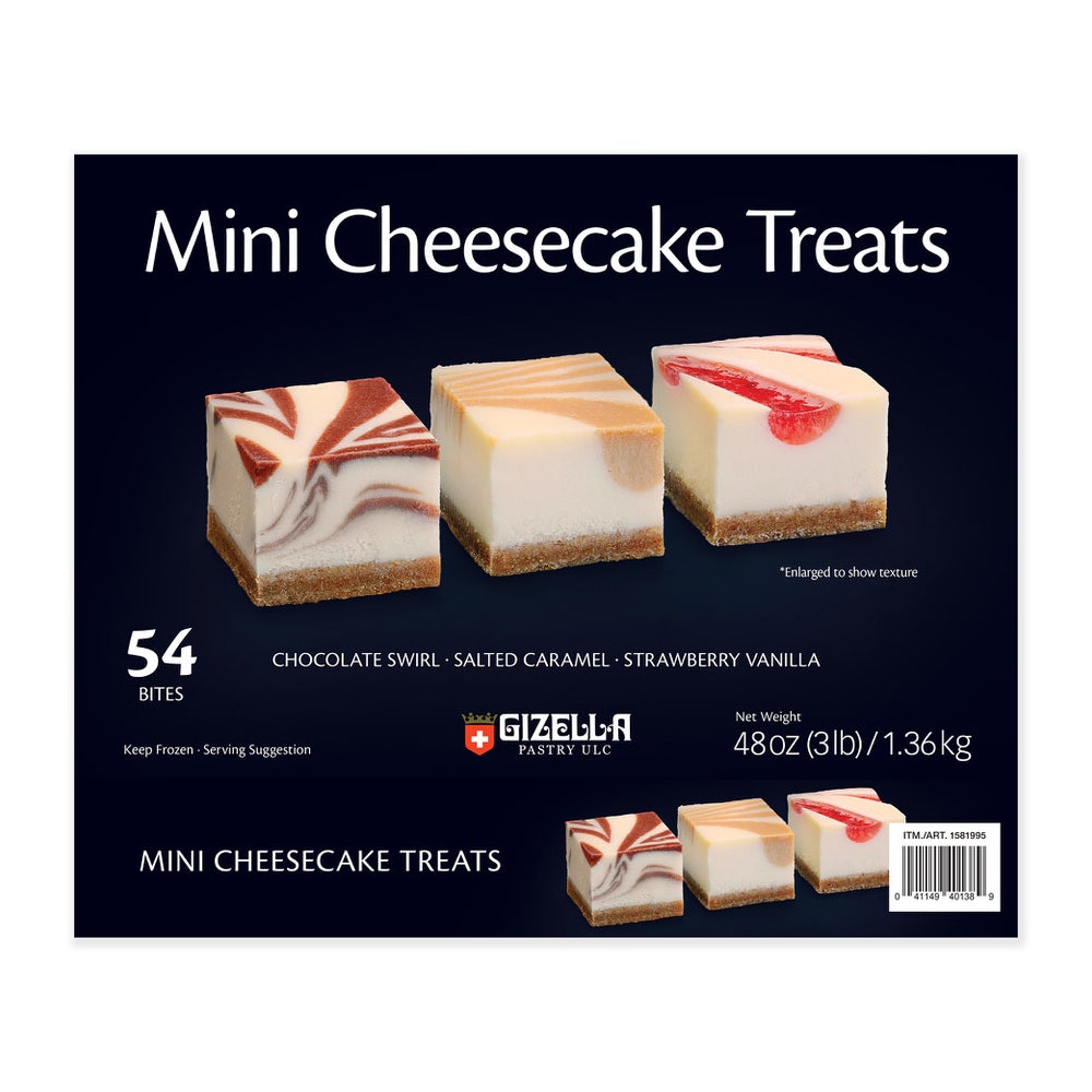Gizella Pastry Assorted Bites Strawberry Vanilla Mini Cheesecake, Chocolate Swirl, Salted Caramel, 54 Ct Box, 8/Case