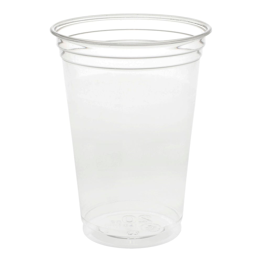 - These recycled PET cups are made with 25% post consumer recycled plastic bottles, which helps reduce landfill waste. These 20 ounce cups are strong and durable and the clarity beautifully displays your signature beverages.