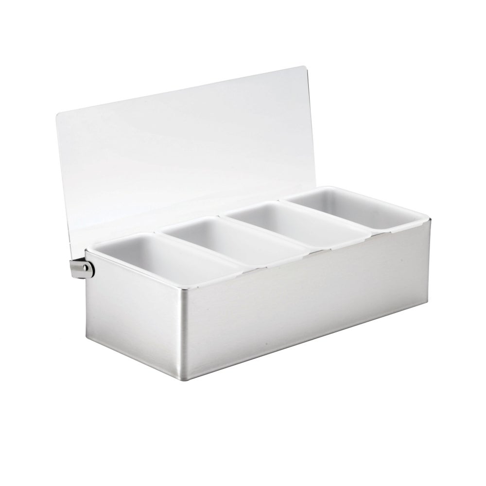 TableCraft 4-Compartment Bar Condiment Dispenser, Stainless Steel, with Tongs, 1/Each