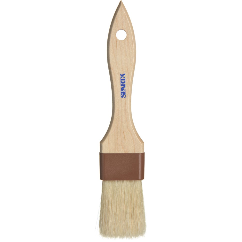 This professional basting brush is double-boiled, bleached, and sterilized for sanitation. It has a lacquered hardwood handle with brown nylon ferrules for reinforcement and its boar bristles offer high fluid retention, ideal for fine pastry washes.