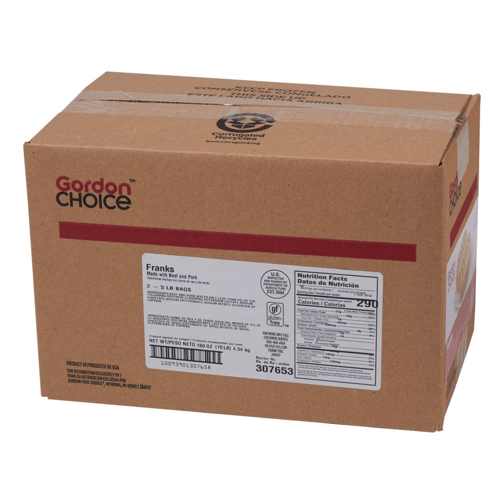 Gordon Choice Beef & Pork Franks, 6 Inch, 5 Count per Pound, Frozen, 5 Lb Bag, 2/Case