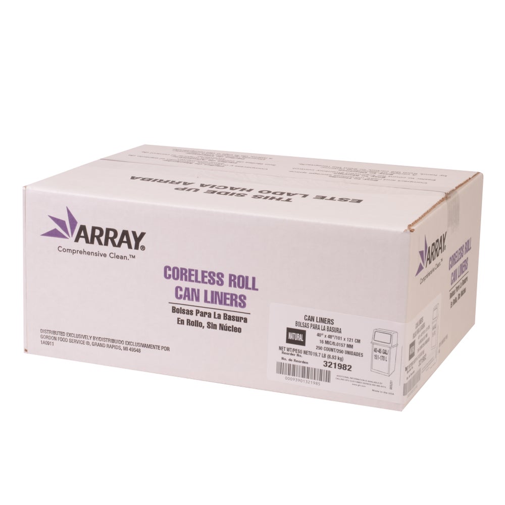 Array 45 Gallon Clear Can Liners, High Density, 16 Micron, 40 x 48 Inches, 25 Ct Roll, 10/Case