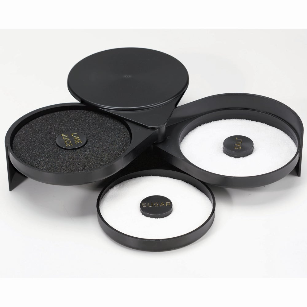 Essential equipment for crafting daiquiris and margaritas, this 3-level glass rimmer includes a wetting sponge and receptacles for rimming glasses in salt or sugar. The rimmer's black color matches many decors.