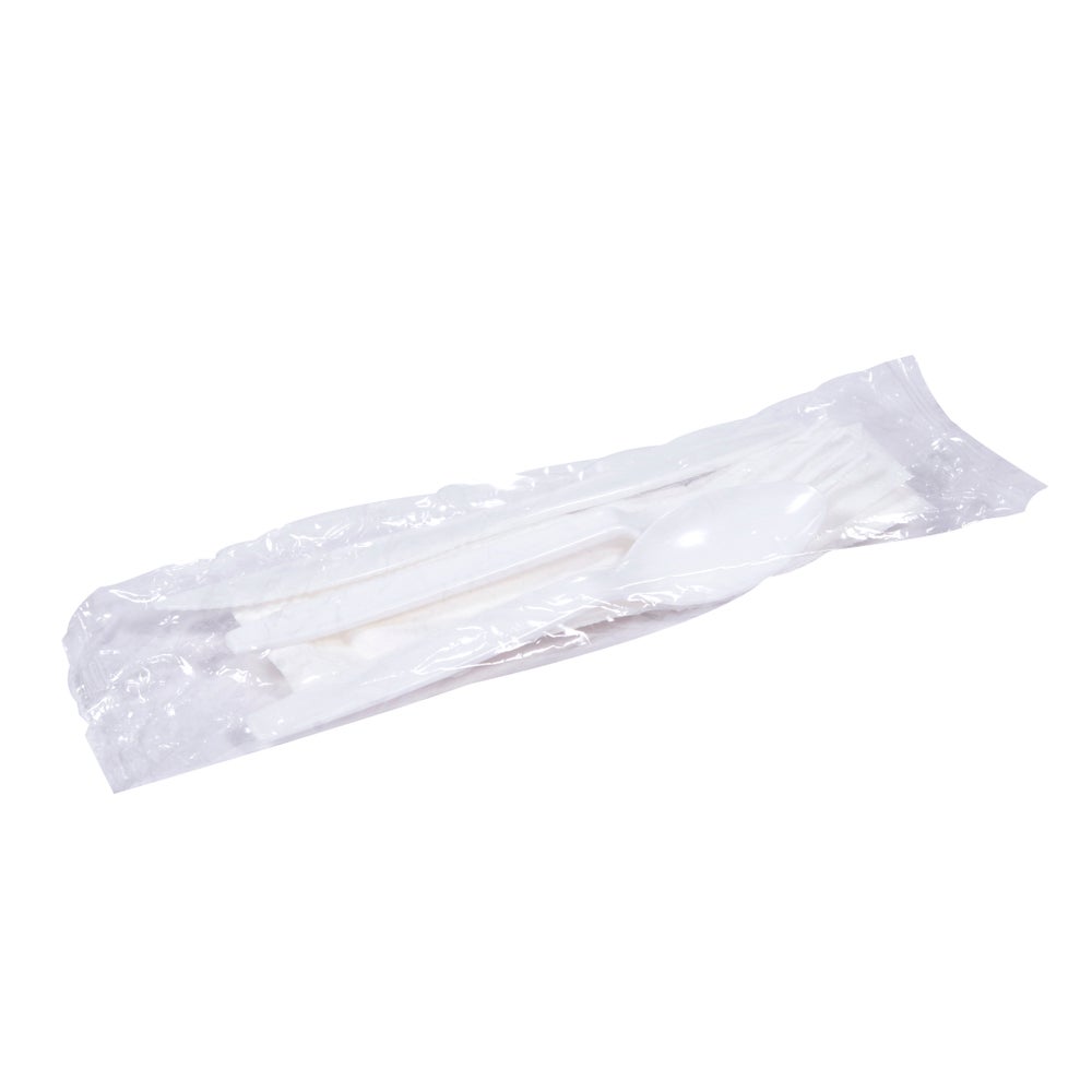 - Each cutlery kit contains a durable, medium-weight knife, fork, spoon and a 13-inch by 17-inch single-ply white napkin.