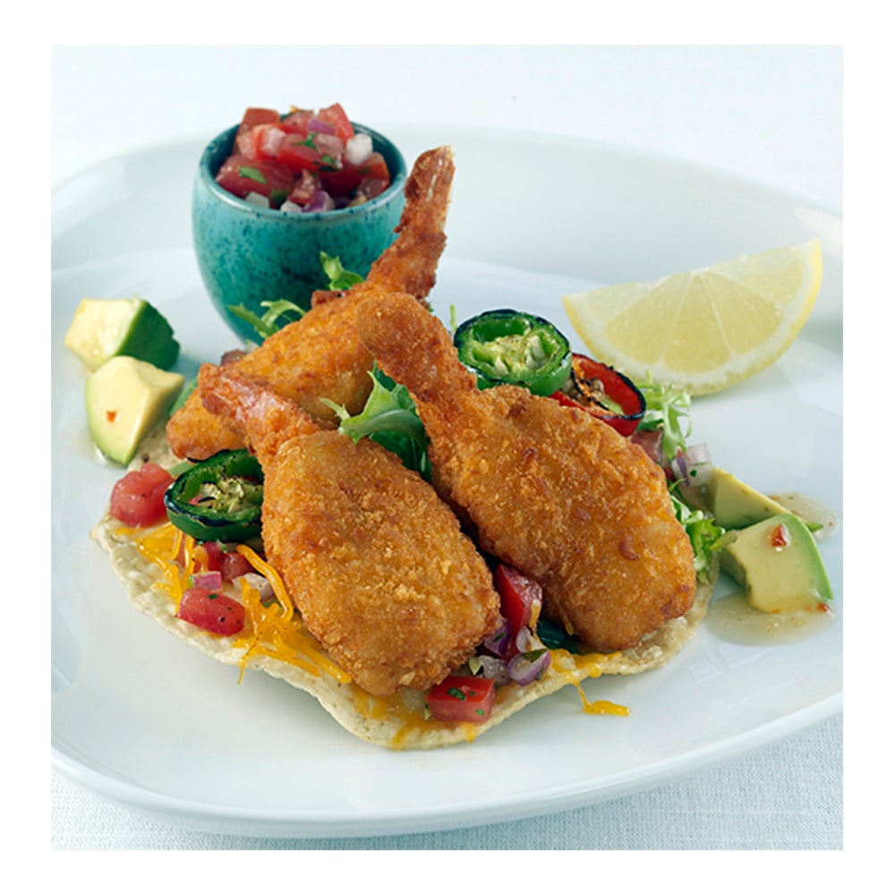 These breaded, butterflied shrimp are filled with cheddar, Monterey jack, cream cheese, and diced jalapenos. They are then coated with a seasoned breading which cooks to a light, crunchy finish.