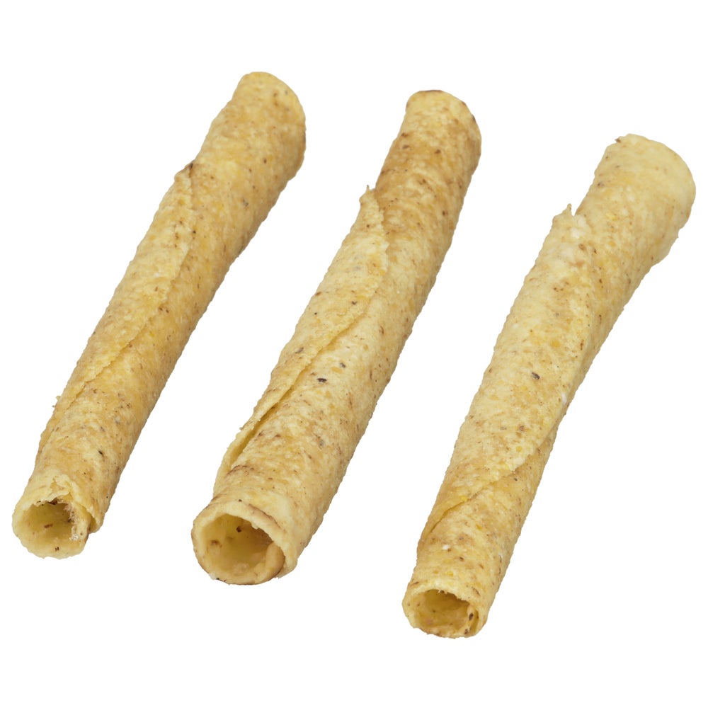 Fresh corn tortillas are stuffed with chicken and green chili peppers to create a homemade, hand-rolled appearance.
