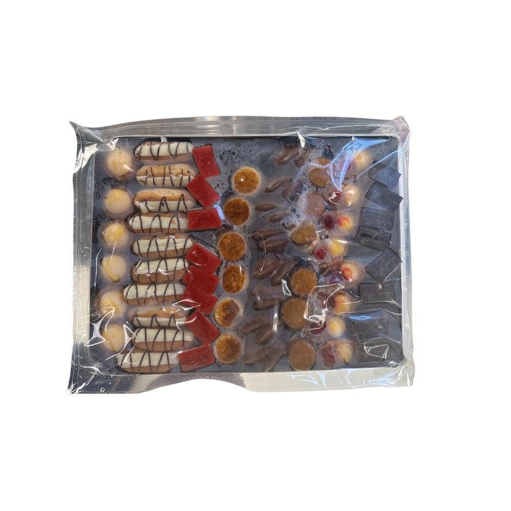This selection of 8 petit fours provides a cross section of flavors, textures, shapes and colors. The flavors included are creme brulee, lemon cream shortbread, Sao Tome chocolate barquette, apple tart tatin, Grand Marnier salambo, crunchy chocolate coffee diamond, raspberry passion fruit barquette, and berry dacquois.