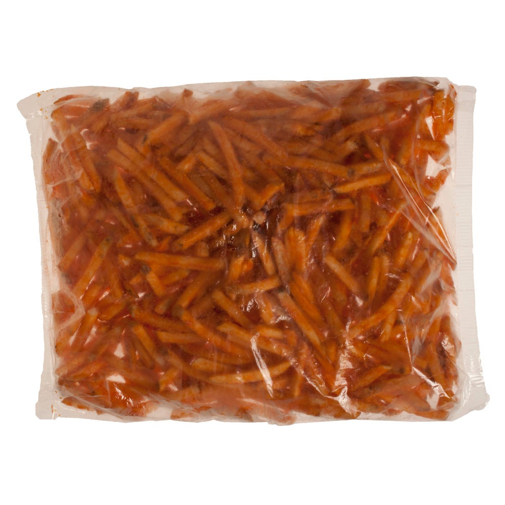 These regular-cut fries feature a light, red batter coating that keeps them crispy and delivers a fried potato flavor with a light taste of spices and salt.