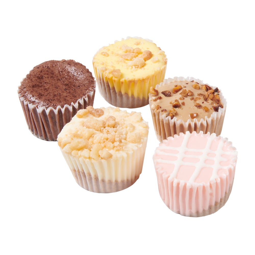 • This mini cheesecake assortment includes: Chocolate, New York Vanilla, Lemon Cream, Strawberry and Salted Caramel Hazelnut.
