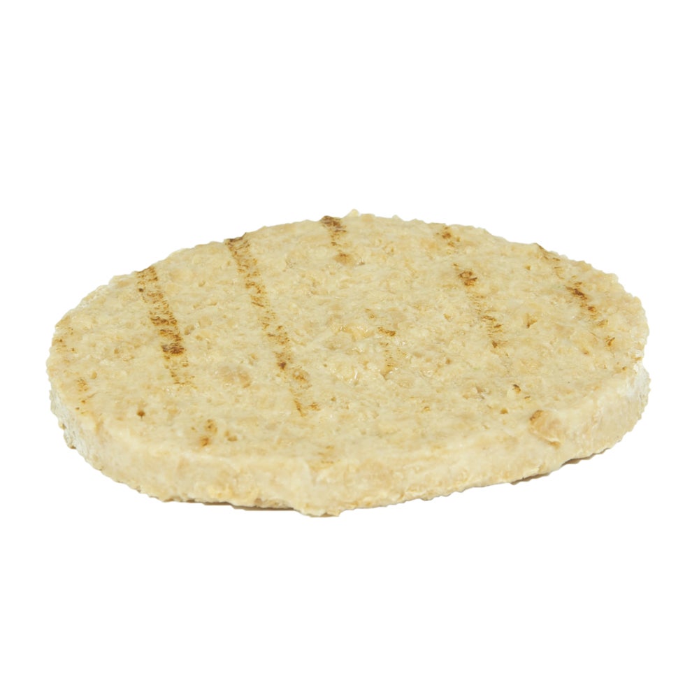 These 100 percent vegan, meatless burger patties offer a similar taste to a traditional hamburger. Made from soy protein and wheat gluten, these precooked patties offer less fat, calories, and cholesterol than traditional burger patties.