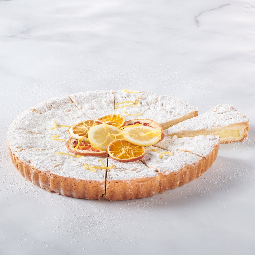 • These Lemon Torte cakes feature a bright and refreshing taste of lemon and are made of a shortcrust pastry filled with custard and garnished with pine nuts, almonds and icing sugar.