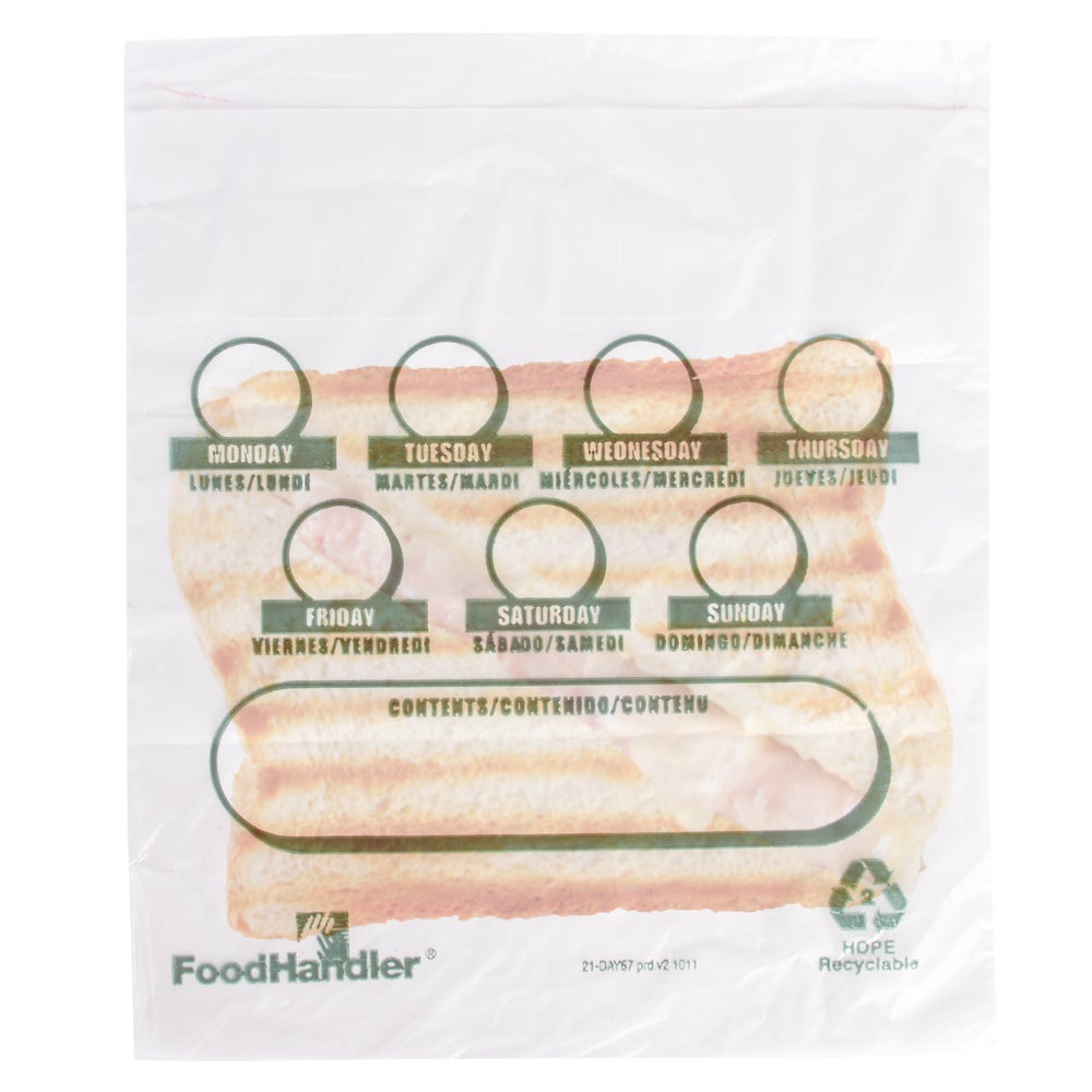 These high-density snack bags protect pre-portioned food from contamination, have a flip top for easy closure, and feature a blank space for writing the day of the week.