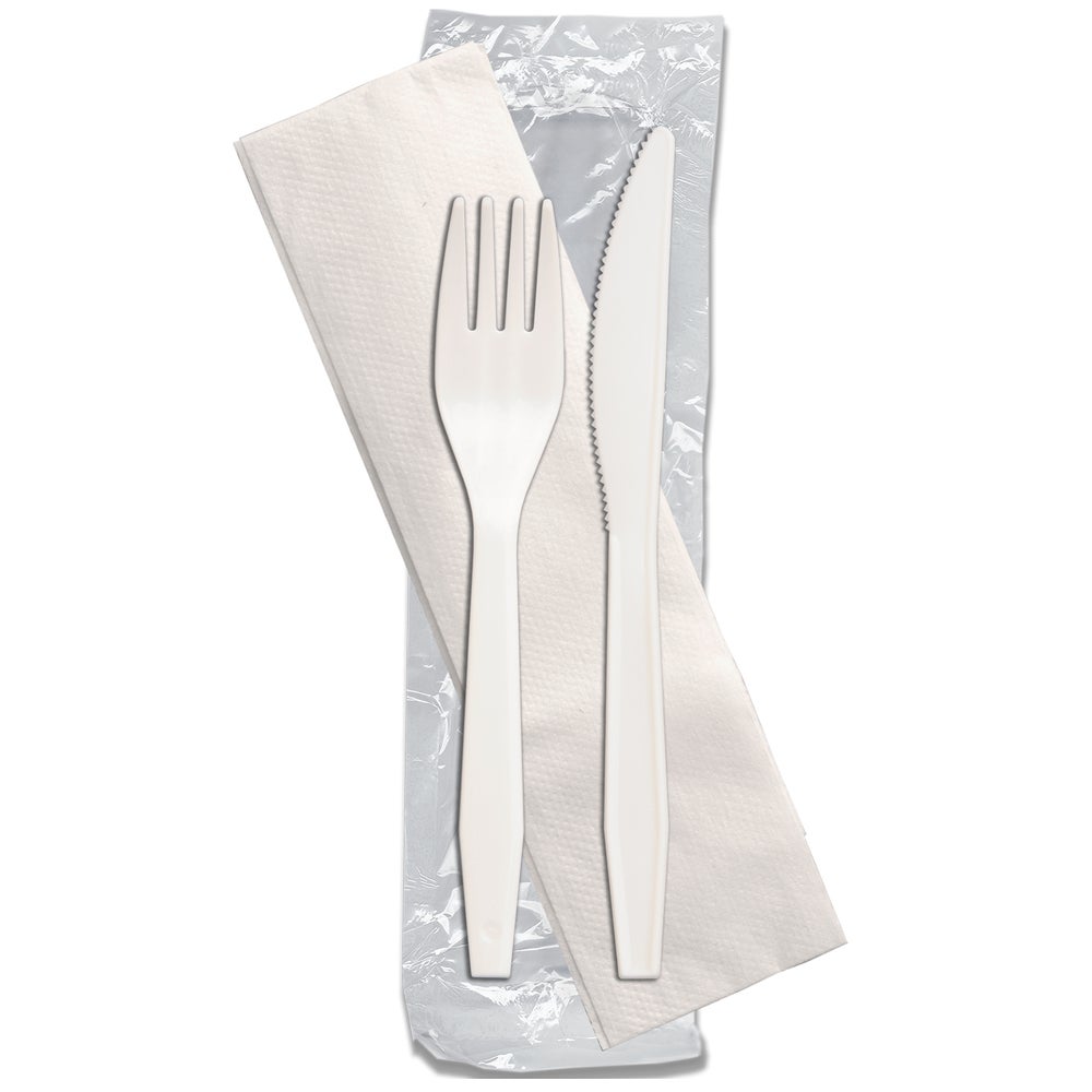 Packer Label Medium-Weight Plastic Fork & Knife Cutlery Kits, White, with Napkin, 250 Ct Package, 1/Case