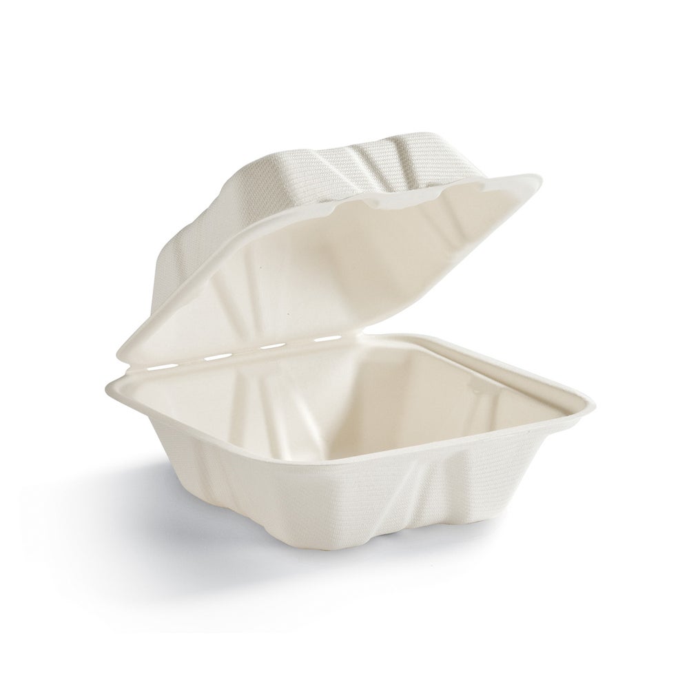 Enviable 6 x 6 x 3 Inch Molded Fiber Containers, Paper, White, Hinged, Compostable, 100 Ct Bag, 4/Case