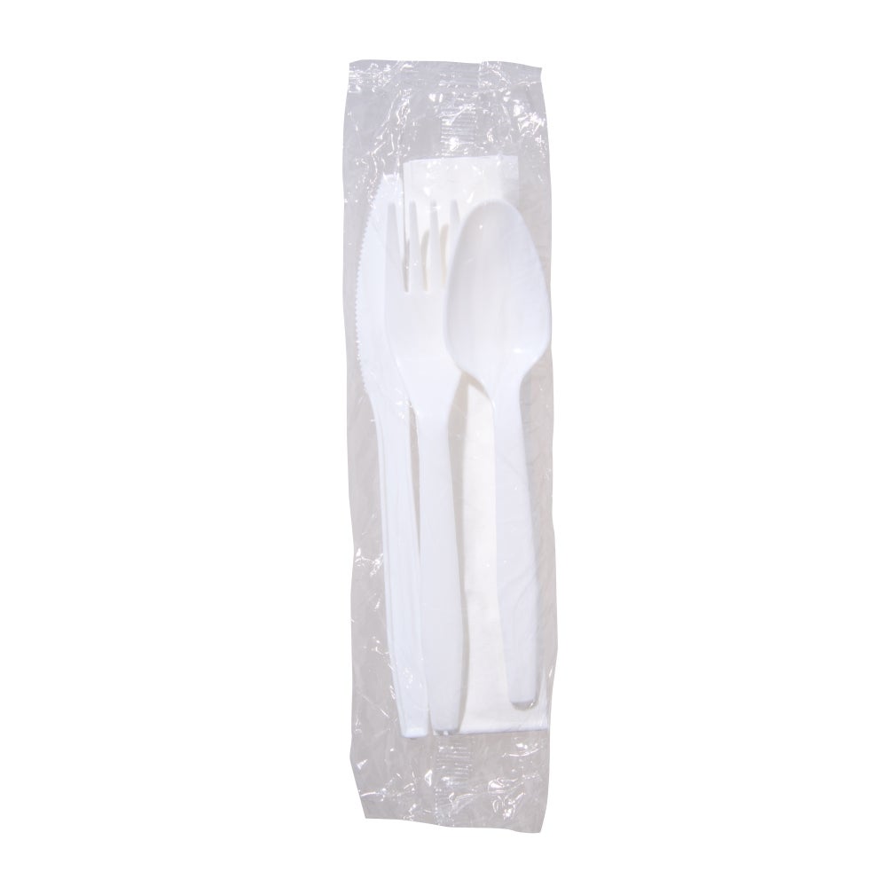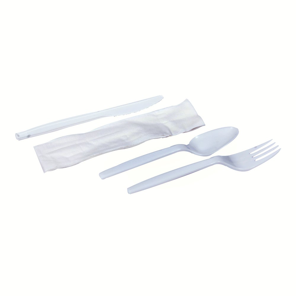 - Enjoy all-in-one convenience with these wrapped cutlery kits. They contain a reliable, medium-weight knife, fork and spoon, plus a paper napkin.