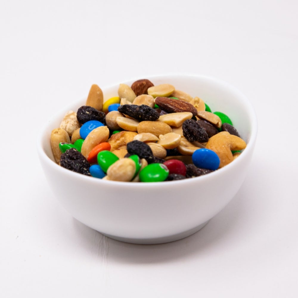 - This hearty trail mix gives a boost of protein to help power through the day, whether on the trail or at a desk. This mix includes candy-coated chocolate candies, dark brown raisins, blonde peanuts and cashews.