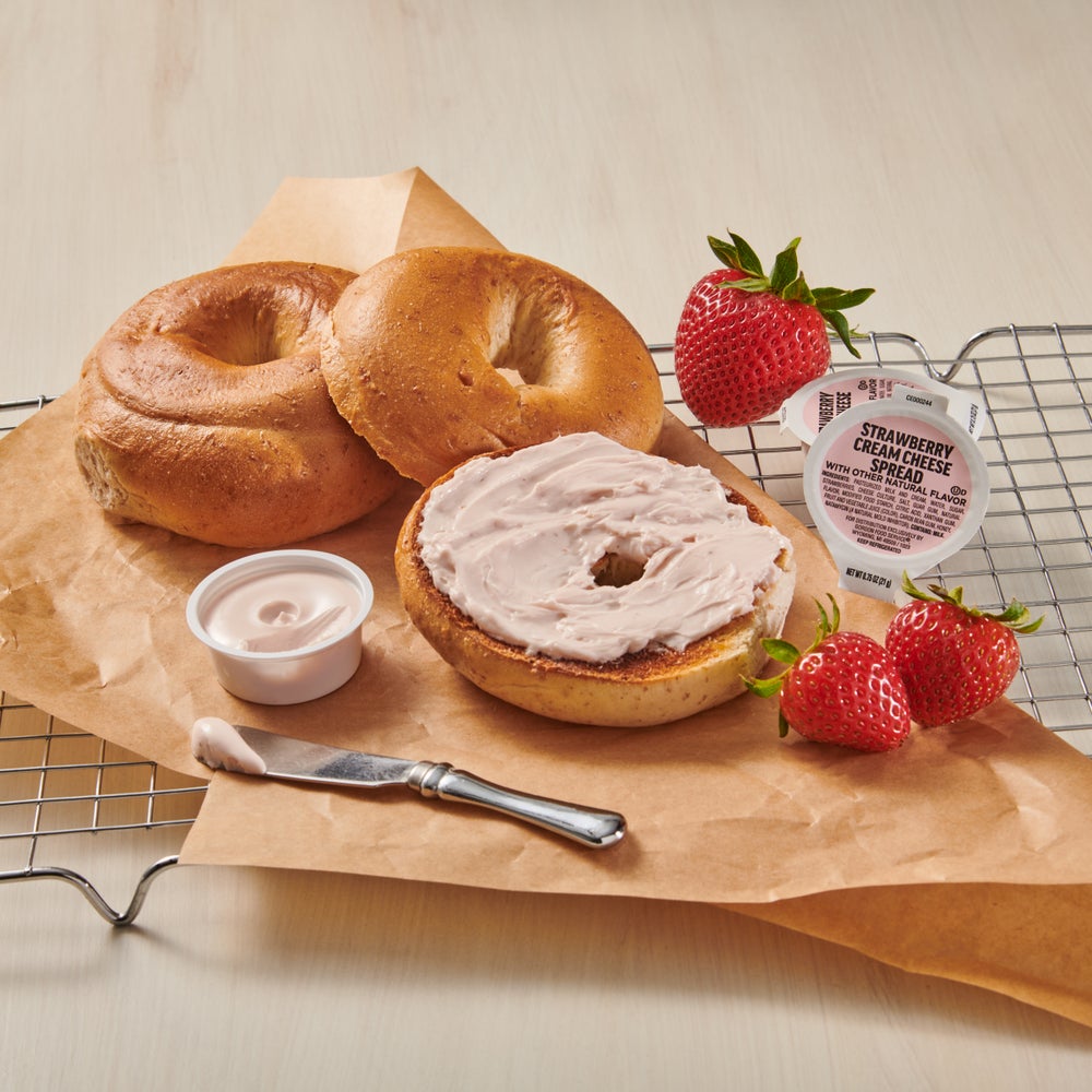 - This cream cheese blends fresh Grade A milk and cream with real strawberries to create a smooth and creamy dairy product. A tangy, fruit-forward flavor lends itself for use on breakfast items such as bagels and muffins as well as a variety of other applications.