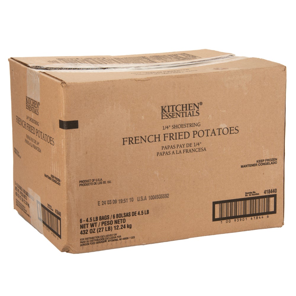 Kitchen Essentials 1/4 Inch Line Flow Shoestring Cut French Fries, Frozen, 4.5 Lb Each, 6/Case