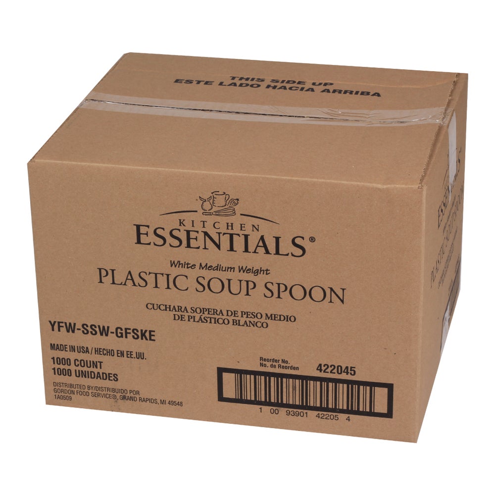 Kitchen Essentials Medium-Weight Plastic Soup Spoons, White, with Medium-Length Handles, Polypropylene, 1000/Case