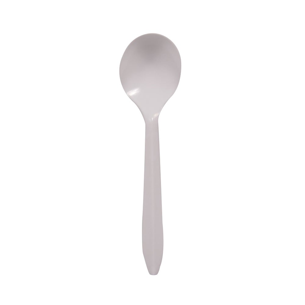 - These reliable, white, medium-weight soup spoons are handy and durable. These polypropolene utensils will bend, but they won't break.