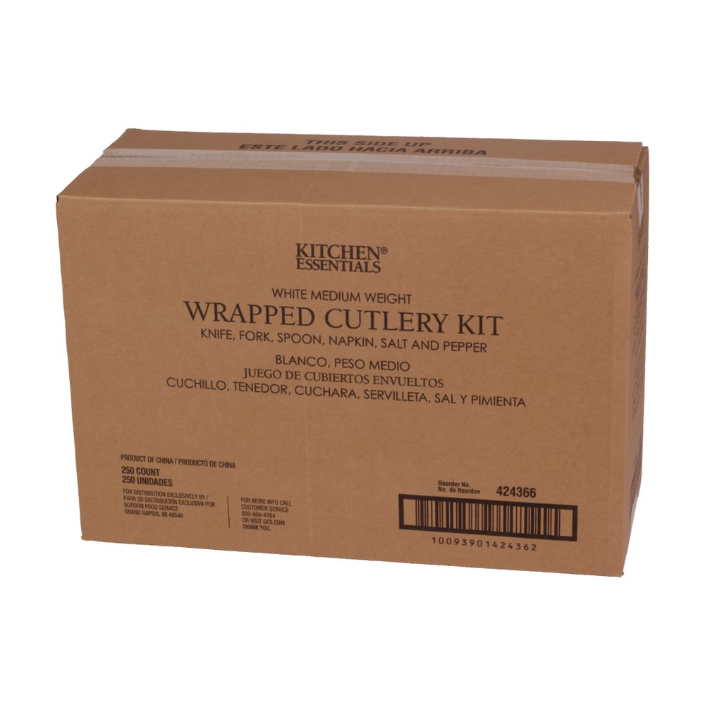 - Enjoy all-in-one convenience with these wrapped cutlery kits. They contain a reliable, medium-weight knife, fork and spoon, plus salt and pepper packets and a 13 x 17 inch, one-ply paper napkin.