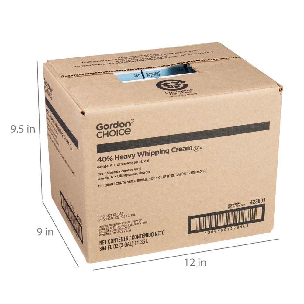 Gordon Choice 40% Heavy Whipping Cream, Grade A, Extended Shelf Life, Refrigerated, 1 Qt, 12/Case