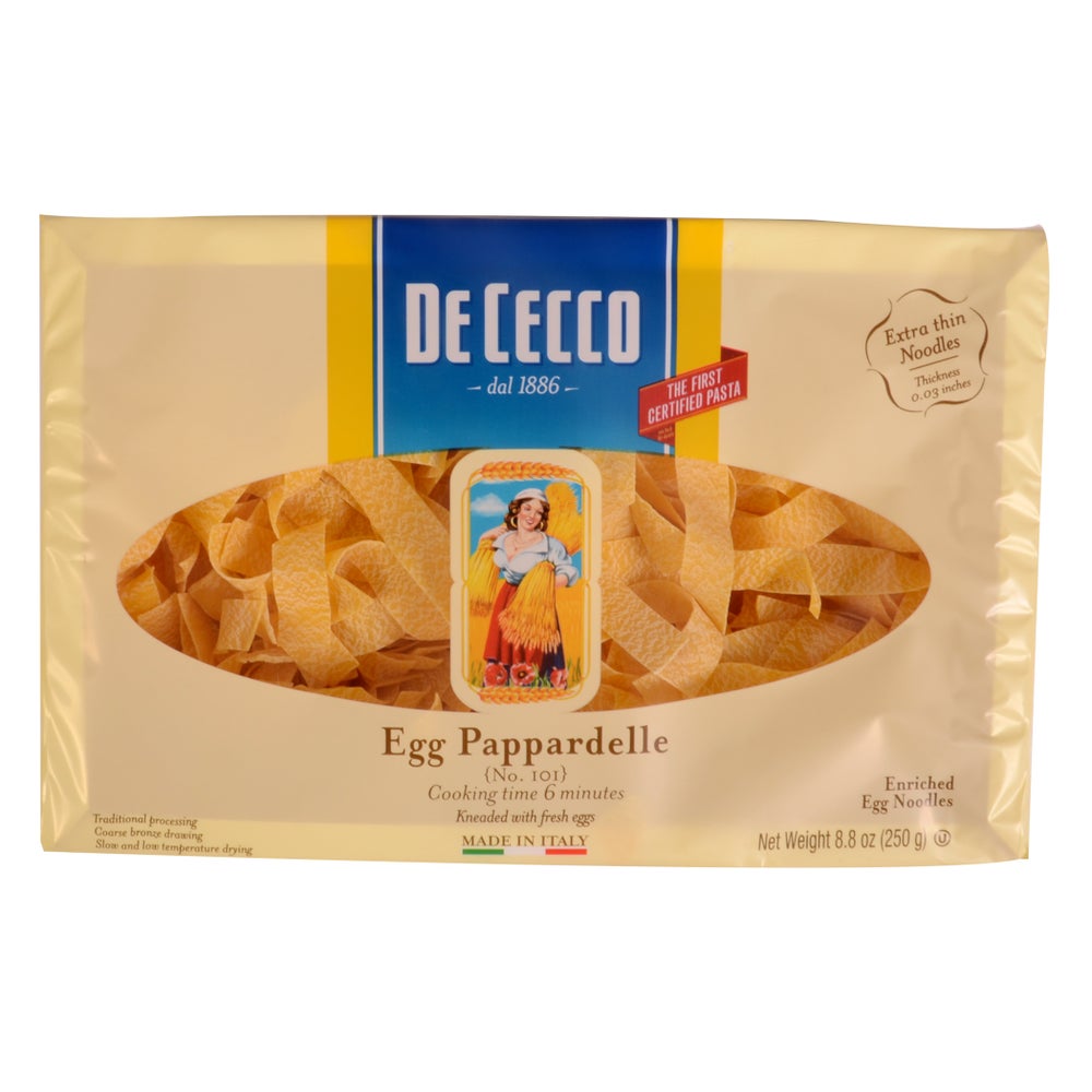 This pappardelle egg pasta retains its shape and firm texture when cooked, offering a delicate and fragrant flavor of milled semolina. Made with 100 percent durum wheat semolina, this Italian pasta has a slightly rough surface that allows sauce to cling easily.