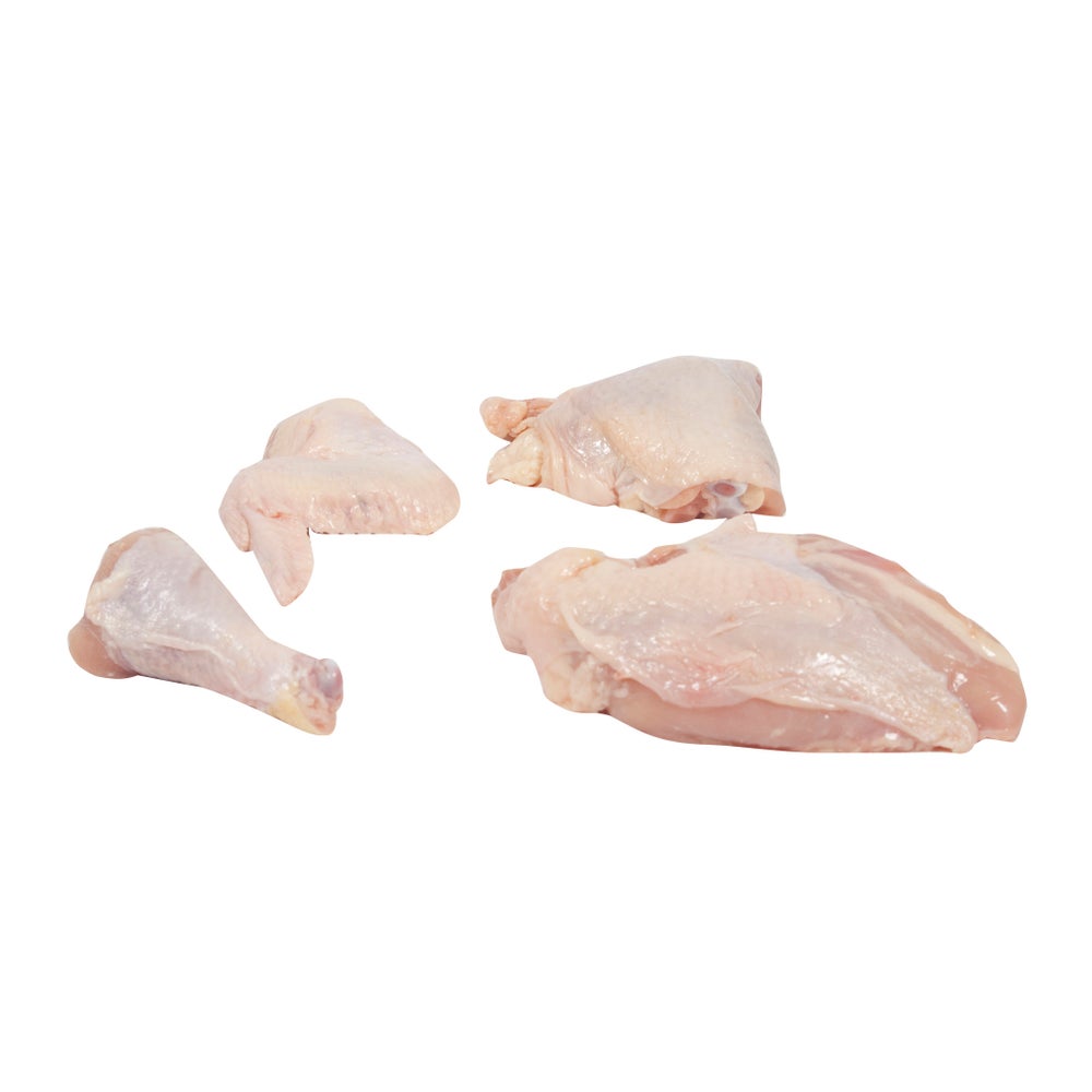 - Fresh chicken is never frozen and is a delight to incorporate into your menu. These chicken portions include a natural proportion of breasts, drums, thighs and wings. The necks and giblets have been removed.
