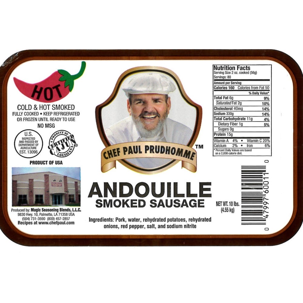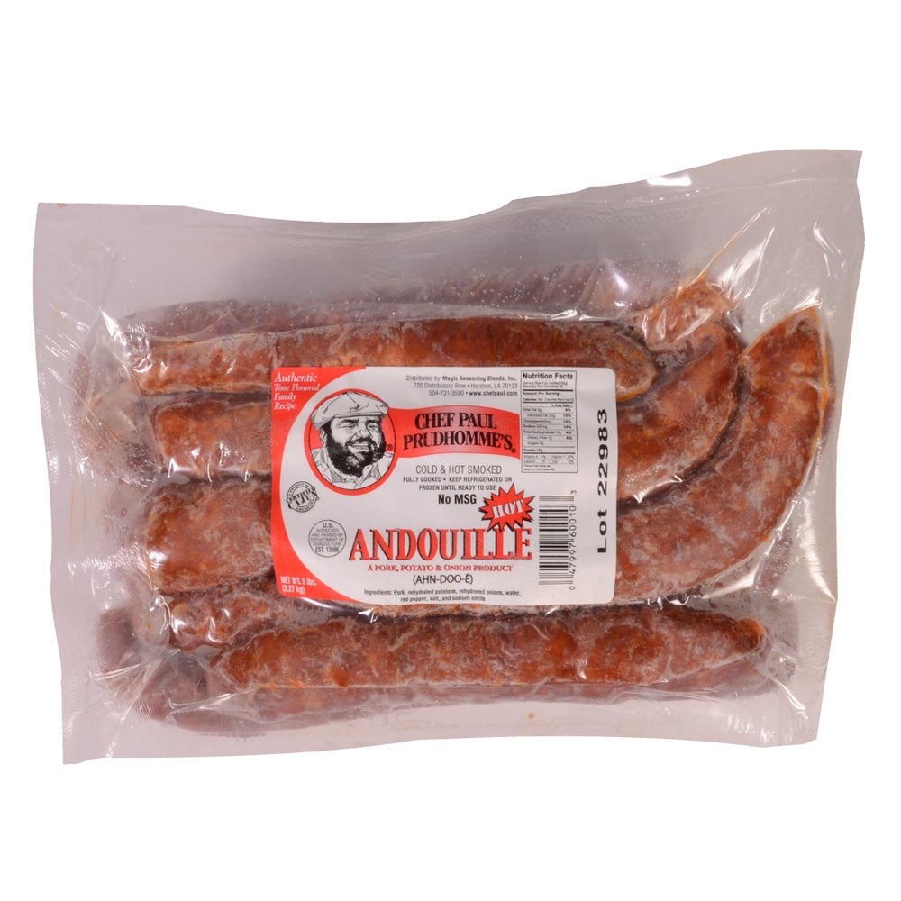 Chef Paul Prudhomme's Hot Cajun Andouille Pork Sausage, Rope, Natural Casing, Cooked, Frozen, 5 Lb Bag, 2/Case