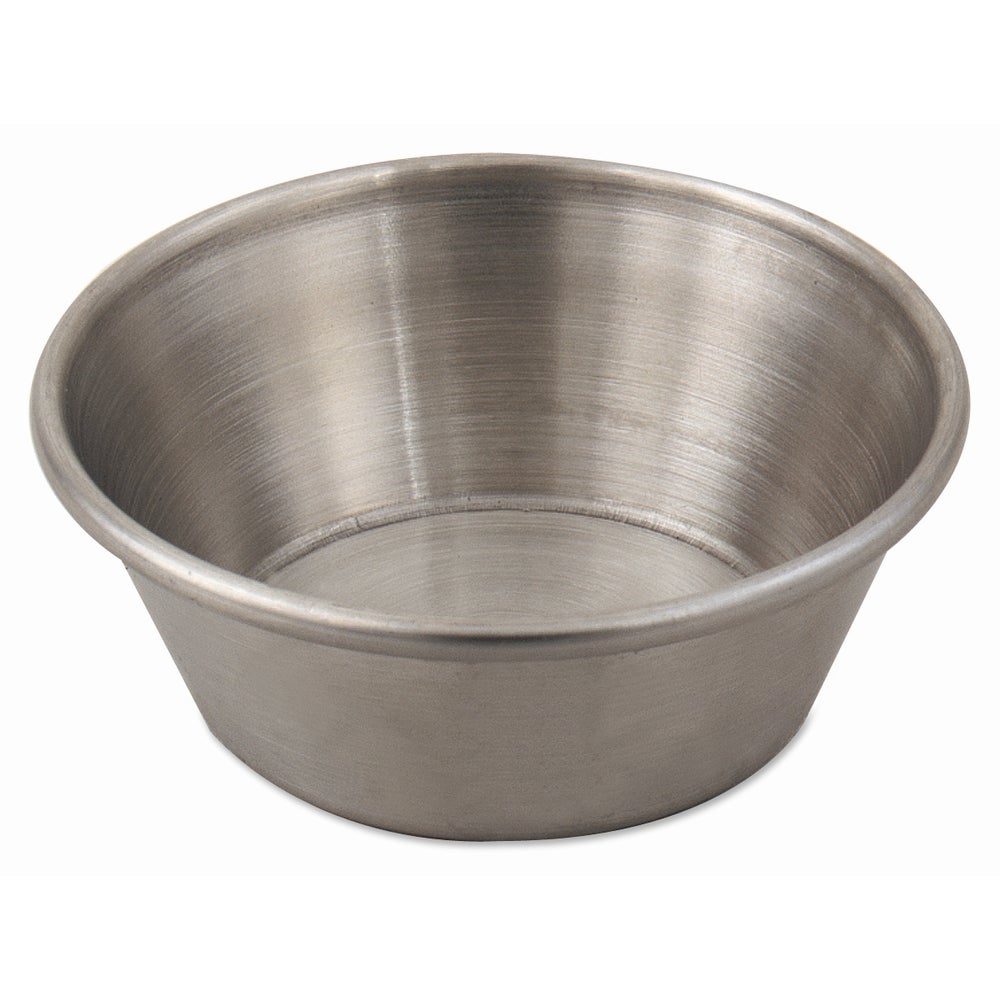 These stainless steel cups feature a mirror finish on the outside and a satin finish on the inside. With a plain rolled edge, they are ideal for use with sauces, butters, or condiments.