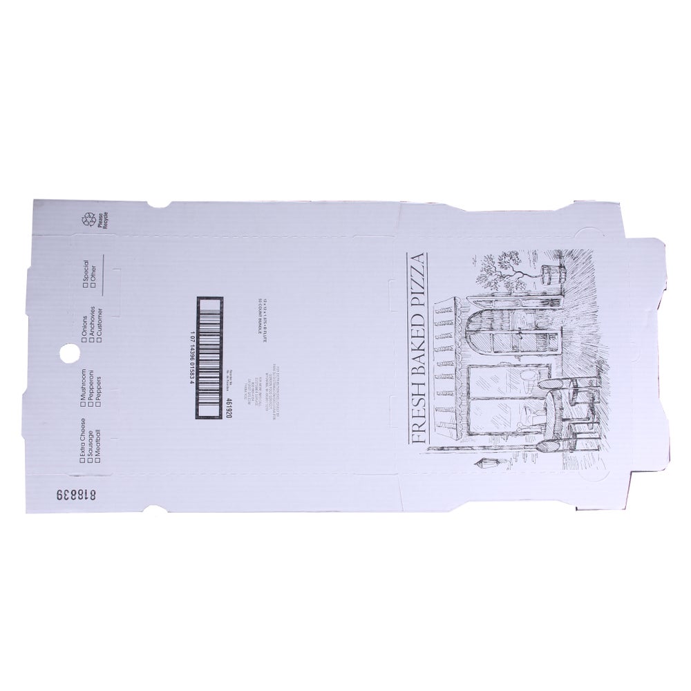 - These pizza boxes are made using B-flute, sturdy kraft board to provide strength, while the white, printed pizzeria exterior provides an attractive presentation. B-flute board is about 1/8-inch thick and tends to warp less than E-flute.