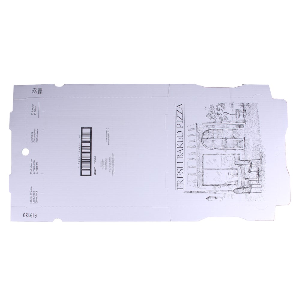 - These pizza boxes are made using B-flute, sturdy kraft board to provide strength, while the white, printed pizzeria exterior provides an attractive presentation. B-flute board is about 1/8-inch thick and tends to warp less than E-flute.